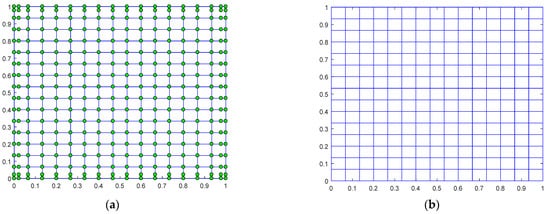 A square plate with 18 × 18 control points and 15 × 15 elements by using cubic NURBS basis function: (a) control mesh, (b) physical mesh.