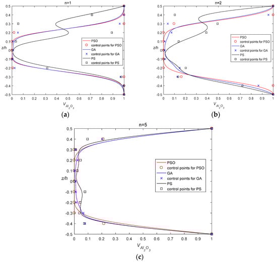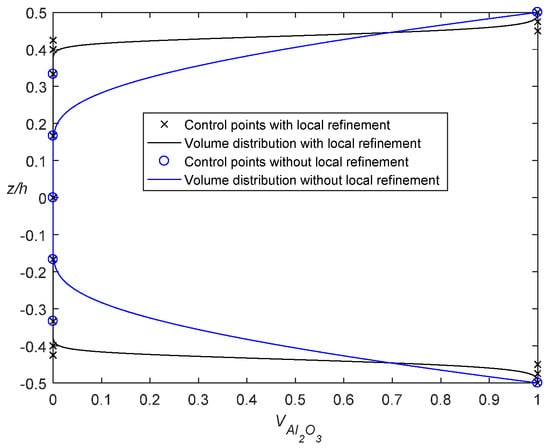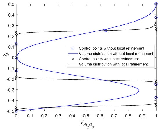 The metallic phase has a lower stiffness compared to the ceramic one. Thus, increasing the amount of the ceramic phase may increase the natural frequencies. In this case, a maximum natural frequency is demanded with the constrained mass. Thus, theoretically speaking, the best result will be achieved in the case that the volume fraction of ceramic is close to the maximum value, i.e., 50% of the plate in terms of the constraint . The fact is confirmed by Figure 10. The optimization increases the dimensionless fundamental natural frequency to 106.63 by 21.51%. In Figure 10, we notice there are three graded zones, i.e., (−h/2, −3h/8), (−h/4, −h/8), and (h/8, 3h/8). Therefore, we insert four extra control points in the each region to refine the graded zone, and establish the optimization problems as