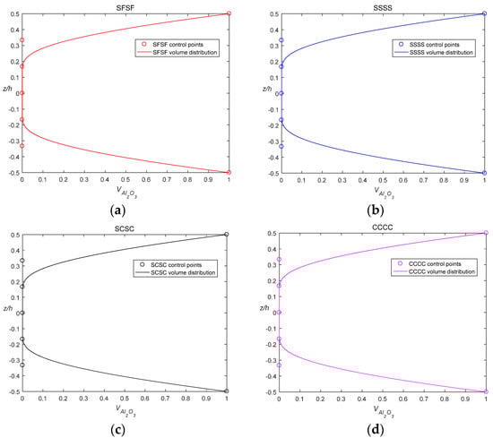 Volume fraction distribution for different boundary conditions: (a) SFSF; (b) SSSS; (c) SCSC; (d) CCCC.