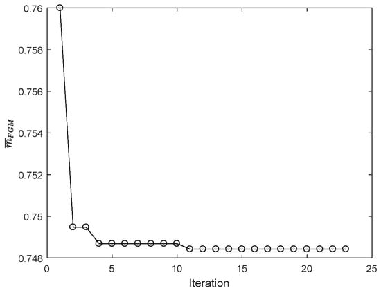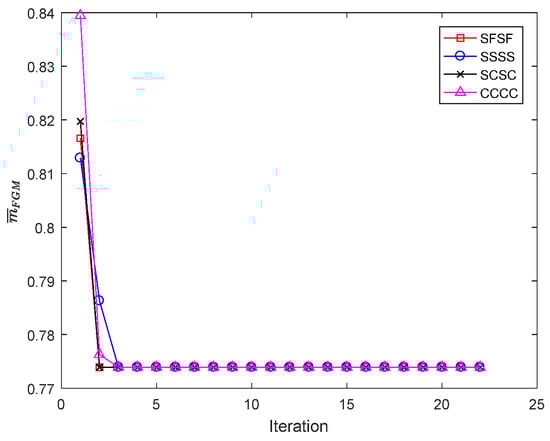 The optimal parameters are tabulated in Table 6. The results and volume fraction distributions of the locally optimized FG plate are shown in Table 7 and Figure 8. The iteration history of the solution of the problem (48) is displayed in Figure 9. The parameter to describe the thickness of the transition zone is the lower bound , and the width of the refined transition zone is much smaller than the one without refinement. The dimensionless mass of locally optimized FGM is 0.7486, 12.57% lighter than the power-law FGM plate, and 3% lighter than results without the local refinement. Nearly a 3% improvement can be seen from Table 7, which is nearly 30% of the optimum mass without local refinement.