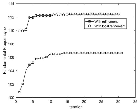 The iteration history of the objective function for frequency optimization with and without refinement.