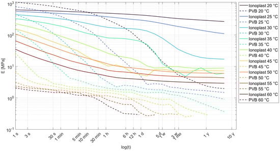 Comparison of Young’s modulus, E (MPa), degradation for the ionoplast and PVB interlayers in dependence on the load duration log, (t(s)), at different temperatures, T (°C) [19,20].