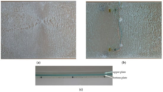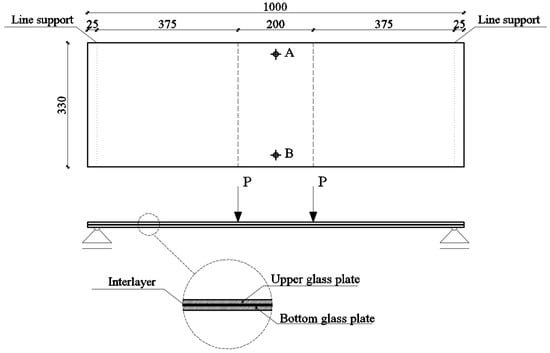 The test setup is presented in Figure 3 and Figure 4. Strains at the upper and bottom glass plates at points A and B (marked on Figure 3) were measured with four strain gauges. In all of the specimens, fractures occurred on the bottom plate, while the upper plate remained undamaged; see Figure 5. After the initial cracking of the bottom plate, the load-bearing capacity is reduced. After complete cracking, the glass can no longer withstand tensile stresses, but glass fragments remain attached to the polymer interlayer. In this phase, the polymer can provide the tensile force together with the lower part of the upper plate to withstand bending moments. At this stage, the load capacity also depends on the size of the fragments, which is directly related to the type of glass. In our experimental tests, fracturing occurs at the bottom plate, and such a cracked panel remains loaded with 1 kN of force without a significant increase in deflection.