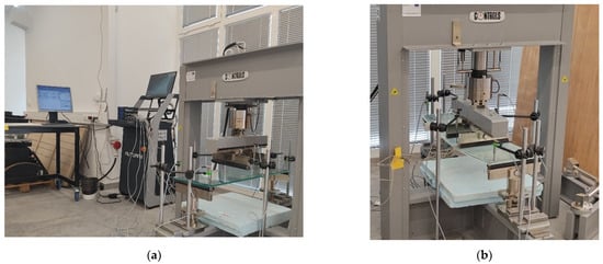 The available data and the mentioned analyses suggest the need for a parametric analysis of the influence of temperature change on the behavior of laminated glass loaded outside the plane. In order to perform this analysis, it is necessary to verify the numerical model with an experimental test. The experimental test on laminated glass specimens was carried out in the Structural Laboratory of the Faculty of Civil Engineering, Architecture and Geodesy. Laminated glass specimens were exposed to four-point bending. Specimens were made out of two tempered glass panels with a thickness of 6 mm. Glass panels were connected with a 0.76 mm-thick Saflex DG41 PVB (EASTMAN, Kingsport, TN, USA; E1min,25 °C = 387 MPa; G1min, 25 °C = 131 MPa; ν = 0.476) interlayer. The span was 950 mm, while the width and length of the specimen were 330 mm and 1000 mm, respectively. Hard contact of the steel bearing and the glass panel was prevented with 0.1 mm-thick rubber protection. The specimens were bent uniformly, increasing the bending stress at a rate of 2.0 N/mm2.s, until failure occurred, according to EN 1288-3 [35]. Specimens were exposed to the same load at the same temperature (25 °C) and moisture conditions (50%). All of the specimens were produced one year before the test, and they were stored in the same conditions.