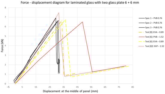 The results for all of the tested specimens are presented in Figure 6 and compared to the four-point bending tests on glass elements of Pankhardt and Balázs [8]. In the graph, only the results of the laminated glass panel tests are presented. It is evident that the results at room temperature do not differ significantly. The contribution of the interlayer to the global behavior of the glass panels at room temperature is minimal. Another comparison curve is from the experimental tests provided by Serafinavicius et al. [6], where the authors tested laminated glass composed of two 6 mm thick panels with PVB (1.52 mm), EVA (0.89 mm), and SGP (1.52 mm) interlayers.