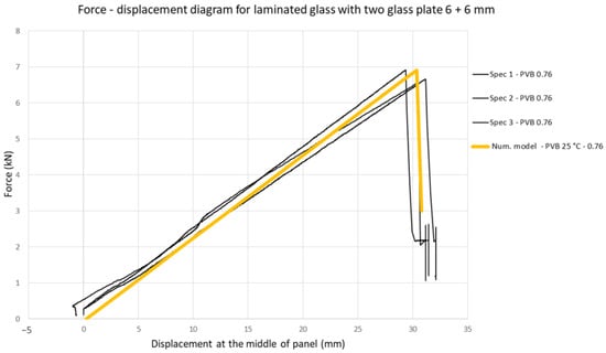 Based on geometry and the loading of the presented experimental tests, the numerical model is developed. The model is developed in ANSYS software, and it consists of two glass plates connected with an interlayer. The model is discretized with 3D solid elements, with minimal two-element through-thickness of the interlayer, and the element-size ratio for the glass panel is not bigger than 1.5 interlayer elements. Contact between the glass and interlayer is defined as an absolute bond, such that only interlayer shear deformation occurs in the middle, without any sliding. The glass panel is supported on two ends with a span of 95 cm. The load is placed at the same positions as in the four-point bending test, with two line loads at equal distances from center of plate, 10 cm on each side from the mid-span. The used material characteristics for the glass are shown in Table 1 and Table 2, and those for PVB in Table 3, as well as Figure 2. Some basic information for the numerical model is presented in Table 4. For the validation of the experimental test, Young’s modulus and Poisson’s ratio are adopted according to the total test duration and test temperature (E1min,25 °C = 387 MPa; G1min,25 °C = 131 MPa; ν = 0.476). The shear modulus is calculated in dependence to Young’s modulus and Poisson’s ratio. The numerical model (with PVB) is validated with the presented experimental data for the first loading stage (fracture on the bottom glass plate). In Figure 7, a good coincidence in the numerical compared to the experimental results can be seen. Since the obtained numerical results showed a good accordance with the experimental results, this model was considered to be validated for further analyses. This all served as an introduction and validation for the following parametric analysis.
