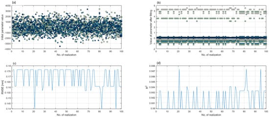 An example of the calculation is shown in Figure 8. In the top-left panel, a set of initial values are displayed, and in the top-right panel calculated values are displayed. The color of a point indicates a specific coefficient. All of the calculated solutions can be sorted into three unique solutions. The metrics displayed in the bottom panels are used as the criteria for the most successful fit. The solution with an RMSE of 0.1397 is chosen as the optimal one, as is displayed in the bottom-left panel. The R2 metric in the bottom-right panel is in agreement with this choice, as the highest R2 is with this solution.