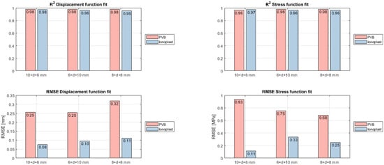 The results presented in Figure 9 display a good fit between the provided data and the analytical model. The average error (RMSE) for the displacement function is less than 0.32 mm for PVB interlayers and 0.11 mm for ionoplast interlayers, and the RMSE for the stress function is under 0.93 MPa for PVB interlayers and less than 0.33 MPa for ionoplast interlayers. The coefficient of determination, R2, is above 0.95 for both interlayers, which suggests a strong relationship between the data and the model. The almost-identical R2 and the larger RMSE for PVB interlayers are due to the wider spread of results in PVB interlayers. The explanation for the discrepancies is numerical data errors in both numerical modeling and function fitting and a dismissed higher-order polynomial that were not taken into account due to the data dissipation.