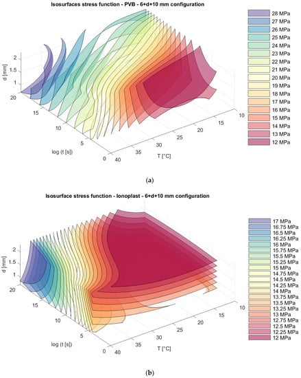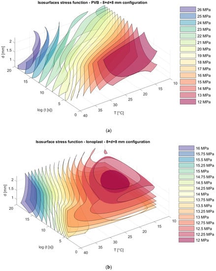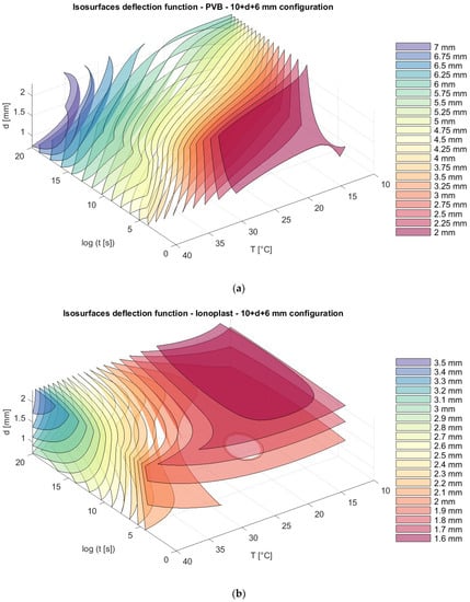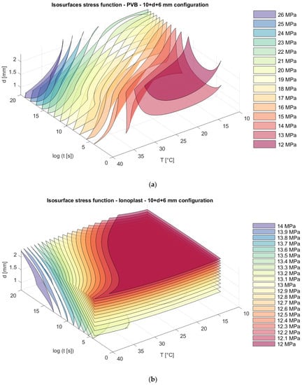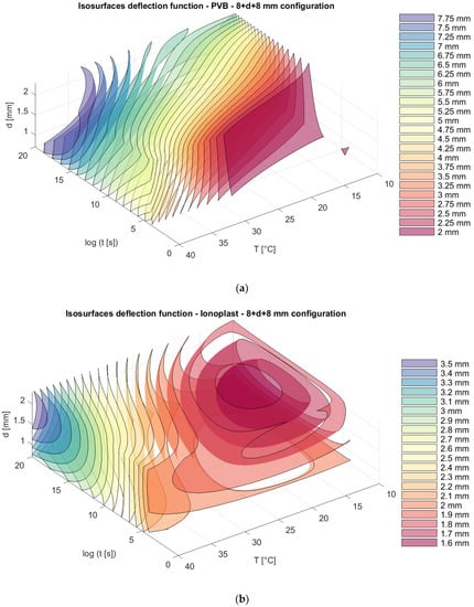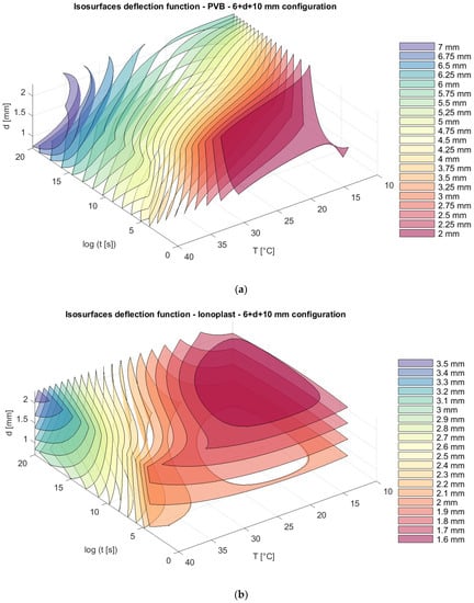 Finally, for all of the information, isosurfaces were created, showing the dependence of the deflection and stress on the specified parameters. The isosurfaces clearly show differences in the behavior of laminated glass panels along described independent variables at different plate-thickness dispositions and for different interlayers. Generally, ionoplast interlayers show higher flexural rigidity and better behavior when higher temperatures and load durations are involved. On the other hand, PVB interlayers have a lower capacity for these types of static loads. As we can see in Figure 10, glass panels with PVB interlayers show larger deflection (for long time loading and an increasing temperature this deflection is double) in comparison with ionoplast interlayers for the presented combinations (thickness of the glass panel, load duration, and temperature).