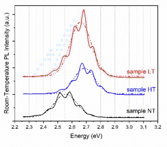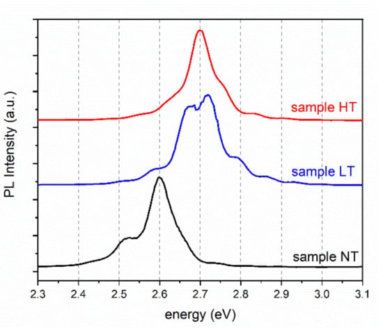 The room-temperature photoluminescence spectra of three samples were measured at the same laser power and the same optical path conditions, as shown in Figure 4. It is obvious that sample LT has the highest luminescence intensity at room temperature, which may be due to the restriction effect of the localized states on the carriers. Although the heat treatment causes more defects in the crystal, the existence of localized states makes it difficult for carriers to be captured by defects.