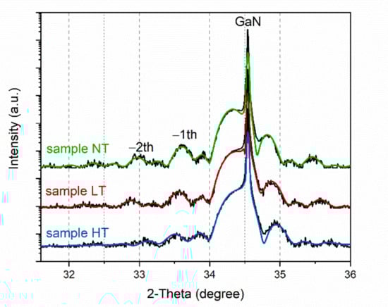 High-resolution X-ray diffraction (HRXRD) ω-2θ scanning curves on (0002) of three samples. The black and chromatic lines are the measurement data and fitting data, respectively. The sharpest peaks at ~34.5° in the figure come from GaN diffraction.