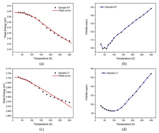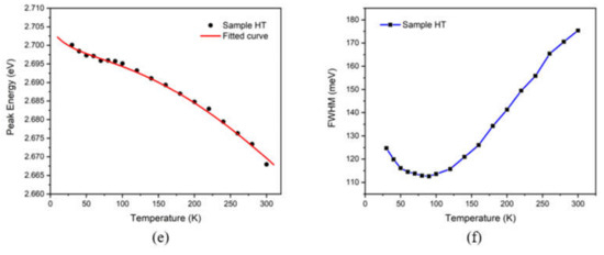 The FWHM shows a characteristic increase with temperature in sample NT, which is due to the increase in the interaction between photon and phonon with temperature increasing, resulting in non-uniform Gaussian broadening. While in sample LT and sample HT, the temperature dependence of the PL peak FWHM is “V-shaped” with a critical temperature at about 100 K, as shown in Figure 3d,f. This phenomenon may be attributed to the formation of a large number of localized states in InGaN/GaN quantum wells caused by the high-temperature treatment [37]. Photogenerated carriers may be fixed in localized states with different potential well depths at an extremely low temperature and recombine radiatively. With temperature increasing, the thermal energy of excited carries increases and they tend to climb over low barriers and relax into deeper localized states, which may lead to a more concentrated distribution of carriers and a narrower spectral width. However, as the temperature rises further, the carriers gain much more energy to overcome the bound of deep localized states and jump to higher energy states; thus, broadening the spectra.
