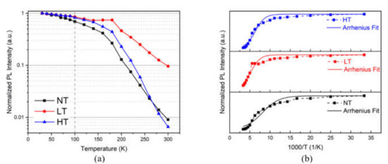 To further investigate the luminescence property, the normalized PL integral intensity as a function of temperature of three samples were measured by a 405 nm semiconductor laser excitation in order to avoid light absorption of GaN layers, but in all of the other sections of this article, a 325 nm He-Cd laser was used for PL measurements. In Figure 5a, we can see that when temperature is lower than 100 K, the PL intensity of samples LT and HT are almost the same and slightly higher than that of sample NT. It can be interpreted that the existence of localized states reduces nonradiative recombination at a relatively low temperature. However, as the temperature continues to increase, photo-generated carriers with higher thermal energy are more likely to be captured by defects during the process when they jump to the higher energy states and the luminescence intensity is reduced. The PL intensity of sample LT is always the highest among the three samples, and it is one order of magnitude higher than that of sample NT at 300 K, which indicates that the localized states generated by In clustering can effectively reduce the probability of carriers to be captured by nonradiative recombination centers and then improve the luminescence efficiency. However, in sample HT, which is also a sample with more localized states, there is no obvious improvement in luminescence intensity and the intensity declines with increasing temperature even faster than sample NT over 200 K. It can be inferred that the InGaN/GaN MQWs treated at 1020 °C contains more defects due to the serious structural decomposition, which increases the probability of carriers being captured by nonradiative recombination centers. It should be noted that the luminescence intensity of both sample NT and sample HT is small at 300 K. Therefore, there is not much difference in luminescence intensity between the two samples when the electrons from GaN barrier layer are excited and luminesce, as shown in Figure 4.