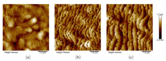 In addition to the internal changes in the samples, we also obtained the information of surface topography. The surface morphologies of three samples were analyzed using AFM in a tapping mode, as shown in Figure 6, and the micrograph scale is 5 × 5 μm2. In Figure 6a, the sample NT shows a morphology of meandering steps interrupted by dislocations, while bunching steps appear in the surface of samples LT and HT, as shown in Figure 6b,c. The step width increases with the increase in heat-treatment temperature from sample NT to samples LT and HT. Additionally, it may be related to the increased migration distance of atoms at a higher temperature. The upmost GaN of samples LT and HT was decomposed and redeposited during heat treatment, which results in the atomic rearrangement and morphologic change in the surface. Meanwhile, the surface roughness increases in samples LT and HT due to trench defects caused by high-temperature treatment as can be clearly seen in AFM images. The roughness of three samples is shown in Table 4.