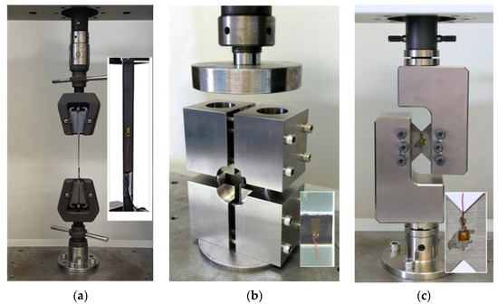 Tensile tests were performed using friction grips and a computerized electro-mechanical Instron (Norwood, MA, USA) machine with a capacity of 100 KN, shown in Figure 2a. Displacement control with a constant crosshead velocity of 0.5 mm/min was applied and the strain was measured utilizing uniaxial SGs (SG -C2A-XX-125LW-350 by Micro-Measurements with a 3 mm gauge length-GL) located at the center of the coupon. In addition, the mechanical response, with attention to the centered hole diameter effect and side notch sensitivity degree, was characterized by testing the same set-up with coupons consisting of a central hole with diameters ranging from 2.5 mm to 9.5 mm and a centered double edge notch with a notch depth (ND) of 1.25, 1.45 and 2.25 mm. For the latter, selected coupons were instrumented by four SGs located: two along the fibers adjacent to the hole and two far away, with one along and the second perpendicular to the fibers. Compression tests were performed by the same machine with similar test conditions using compression fixtures acquired from Wyoming Test Fixtures (Salt Lake City, UT, USA) as shown in Figure 2b. The strain was measured by the same type of SGs as mentioned above. The SG was located at the center of the coupon. The thickness of 2 mm (shear) and 3 mm (compression) was obtained by using 3 M DP460 glue (Saint Paul, MN, USA) with an 80 °C/4 h post-curing temperature. The effect of open holes, with diameters ranging from 2.5 to 5.5 mm, on the mechanical response, was also addressed. Shear properties were established using a Shimadzu 20 kN machine (Tokyo, Japan), with a shear fixture acquired from Thumler GmbH (Nurnberg, Germany) and ±45° SGs (C2A-XX-062LV-120 with a 1.5 mm GL) (Figure 2c). The strain, load, and displacement values were measured simultaneously by a Vishay data logger computerized system 7000 (Malvern, PA, USA).