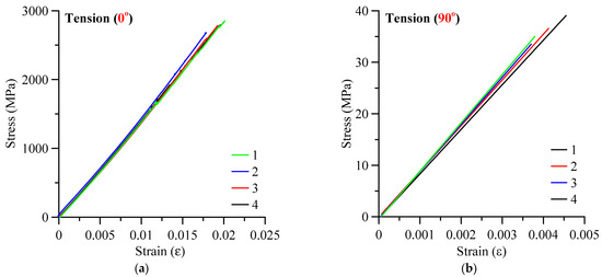 Stress–strain curves in tensile mode for different fibers orientations; (a) 0°; (b) 90°.