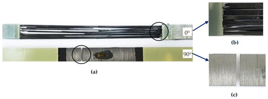 Figure 3a,b illustrates the mechanical response in tension for 0° and 90° coupons, respectively. As shown (Figure 3a), at 0° orientation, the composite exhibits a linear behavior, with a Young modulus of 132.5 ± 1.7 GPa, and a tensile strength of 2799 ± 2 MPa with approximately 2% of strain. These results are in a good correlation compared to a tensile strength of 2550 MPa with a modulus of 135 GPa listed by [23] for nearly the same composite (T700 and epoxy resin) with 60% fiber volume. In the 90° configurations, the tensile strength is approximately 40 MPa, as compared to 70 MPa given in the data sheet. This difference is due to the highest volume fraction in the current composite. Table 1 summarizes the mechanical properties including the Poisson ratio in both orientations. As shown, the deviation of all the measured parameters is very small, which specifies the high reproducibility of this composite. Not shown here, the microstructure characterization indicates a high-quality manufacturing process, manifested by very low defects with almost uniform volume fraction. Figure 4a depicts the macroscopic tensile fracture modes for 0° and 90° coupons. As displayed, the failure of the 0° coupons developed from fracture of fiber bundles (Figure 4b), whereas, for the 90° coupons, the fracture path was flat and occurred at the interface fiber/matrix (Figure 4c).