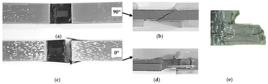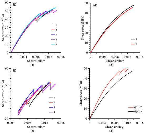 Figure 8 illustrates the shear stress–strain curves for the different orientations 0° and 90°. In both orientations, the mechanical behavior is characterized by elastic–plastic behavior; for 90°, the stress–strain relationship is smooth up to fracture (Figure 8b), whereas for 0°, it ends by two consecutive load drops (Figure 8a,c), similar to the “pop in” phenomena in metallic materials.