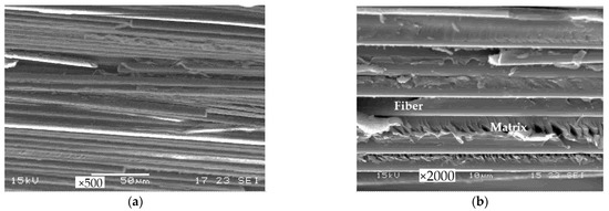 Microscopic fracture modes obtained in compression; (a) general view; (b) serrated type fracture in the matrix epoxy resin.