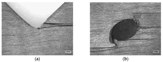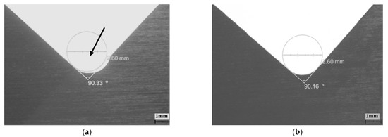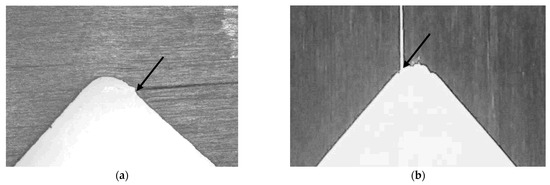 Radius profile and the angle notch for the shear coupon machined in (a) mechanical (arrow mark the defect) and (b) water cutting.