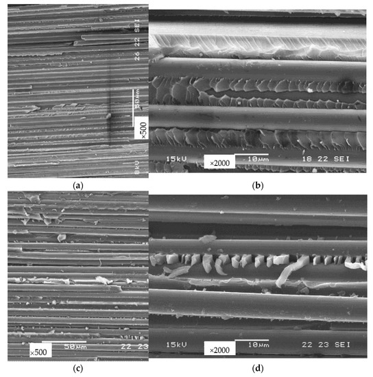 Microscopic fracture modes developed during shear at different orientations; (a,b) 0°; (c,d) 90°.