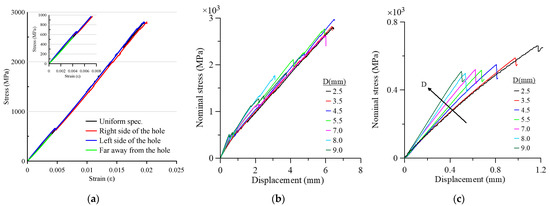 Figure 11a–c shows the nominal stress–strain and stress-displacement related to the presence of holes, while increasing hole diameters from 2.5 mm up to 9 mm. The nominal stress has been calculated according to the net section ((W-D)/t, where W is width, D-diameter and t-thickness). Only selected holed coupons were instrumented by strain gauges. Figure 11a illustrates the stress–strain for a 2.5 mm holed coupon with an expanded region up to 1000 MPa. Almost no change in the Young modulus was noticed for the localized strain gauges and remote gauge, as compared to the reference, which was taken from a uniform coupon. The other curves (Figure 11b,c) are given in terms of displacement, although this display has no physical meaning. The curves lie on a narrow strip with almost the same fracture stress (see Table 4). The first stress drop/relaxation, marked as σnom-r, is noticed in the early stage of loading, at around 500 MPa (see Figure 11c). This phenomenon is related to delamination growth along with the applied load near the hole (see later on). In coupons with a hole diameter of 7 mm, pull out of the fiber bundle occurs at the edges of the tabs before reaching the maximum fracture stress.