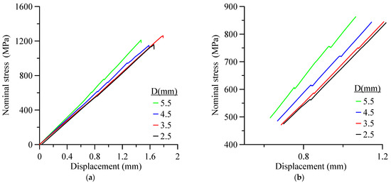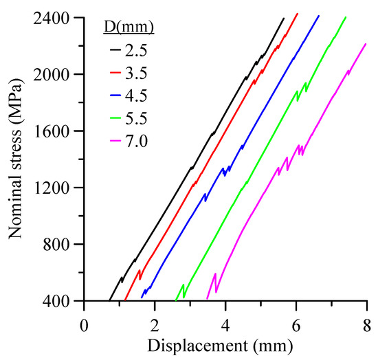 Nevertheless, expanding the stress range up to the σnom-r, (Figure 11c) indicates three trends; (1) The stiffness of the coupon increases as the hole diameter increases, (2) Moderate decreases of σnom-r with hole diameter (see also Figure 12), while excluding the results for holes of 7 mm and 9 mm diameter, is due to the pullout phenomenon. (3) As the hole diameter increases, the change in the load drop increases, which indicates an increase in the delamination crack growth steps (Figure 13). The curves in the last figure were shifted by about 0.2 mm to emphasize the number and the amount of stress relaxation.