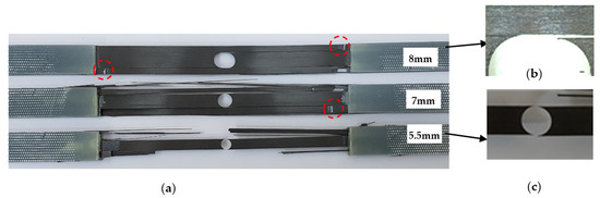 The tensile fracture modes in the holed 0° coupons with different diameters; (a) general view; (b) 5.5 mm; (c) 8 mm (the dashed circles indicate the zone where the fracture occurred).