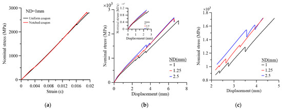 Nominal stress vs. strain and displacement for various notched coupons; (a) stress vs. strain for ND = 1 mm; (b) stress vs. displacement curves up to fracture; (c) extended zone where load relaxations were detected.
