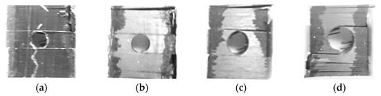 Figure 18a,b presents stress vs. displacement in the compression mode with increasing hole diameter from 2.5 mm to 5.5 mm. The mechanical response is characterized by elastic behavior (Figure 18a) similar to that observed in the un-holed coupons. Minor stress drops were noticed, which intensified as the hole diameter increased (Figure 18b). This behavior is similar to that observed in the tensile mode as a result of delamination growth parallel to the applied load. This mode of fracture is well presented in Figure 19a–d where, in the case of the 5.5 mm coupon, the final fracture was ended by two parts resulting from delamination extension up to the end of the tabs (Figure 19d). The first stress fracture relaxation, the ultimate nominal stress, and the fracture pattern is almost unaffected by the hole diameter as listed in Table 6.