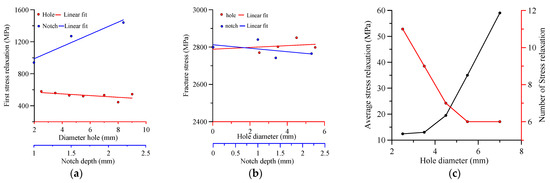 The hole and the notch effect on the mechanical response in tension; (a) first stress relaxation vs. hole diameter and notch depth; (b) fracture stress; (c) the amount and the number of stress relaxations.