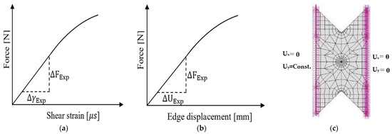 The ASTM standard D7078 [21] cannot be used as is for the determination of the shear modulus of unidirectional composites, since a different modulus is obtained when using 0° coupons, compared to 90° coupons. The correct shear modulus was computed using high-order FEA (Stress Check by ESRD, St. Louis, MO, USA), as explained herein. By using the measured force F, displacement of the right (or left) edge Uy and shear strain γ in the center of the coupon, for the two orientations 0° and 90°, using FEA, one may determine the accurate value of the shear modulus. In the experiments, the applied force vs. the shear strain (F vs. γ), and F vs. displacement curves, are available; so, ∆γ and ∆Uy (as shown schematically in Figure 22a,b, respectively) are used to determine the modulus for a given ∆F in the linear behavior. A 2D plane-stress FE model that mimics the non-gripped region of the shear coupon is created, as depicted in Figure 22c. The mesh consists of a high-order (A high-order element allows to increase the polynomial order of the shape functions from 1 to 8 to monitor the error in energy norm – see Barna Szabo and Ivo Babuska, “Finite Element Analysis”, Wiley, 1991) triangle and quadrilateral elements. On the left boundary, a vertical displacement Uy = ∆UExp and horizontal displacement Ux = 0 is prescribed, whereas, at the right edge clamped boundary, conditions are prescribed. The Young modulus ELt and ETt and Poisson ratio obtained in the tensile experiments are assigned to all finite elements.