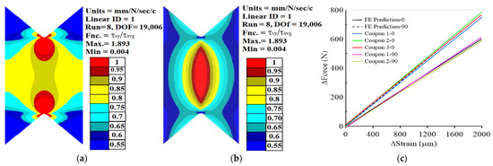 The experimental results, as well as the FEA predictions, follow the same trends as reported by Jinmen et al. [30], using the V-notch shear test for unidirectional hybrid composites. First, the mechanical response, in terms of stress–strain curves, is very similar for both orientations, namely two consecutive load drops for the 0° orientation and a continuous one up to fracture for the 90° orientation. Second, non-linearity is observed in the shear stress–strain curve for both orientations, starting from the lower level of shear strain (around 0.5%), the same order of magnitude as in the current study. They claim that this deviation is related to the initiation of micro-cracks or micro-damage, together with fiber instability at the notch root, rather than the plasticity of the epoxy which exhibits a shear yield strain range of about 6%. This argument is correct based on a preliminary study (not reported here) using the AE method which indicates other damage events instead of the deformation plasticity mechanism of the epoxy resin. Third, the location of the cracks in both orientations initiated at the intersection of the notch root and the straight flank, as in our study, is shown in Figure 9a,b. They confirmed this by FEA and showed that the maximum values of the stress components (σx, σy, τxy) occurred near the intersection point. Fourth, the values of the predicted shear modulus by FEA are independent of the orientation (5.07 GPa) as predicted here (5.37 GPa), as well the average shear modulus is higher for the 0° orientation as compared to the 90° one (6.8 GPa, 4.9 GPa, respectively), as observed here (6.6 GPa, 4.9 GPa). Moreover, they corrected the modulus by extracting the C factor using FEA and found the value for the 90° is close to the one predicted by FEA (5.34 GPa, 5.07 GPa). Here, we also found the same tendency based on FEA. This result is because the 90° coupons had better purity and uniformity in the shear stress distribution over the test region compare to the 0° coupons.