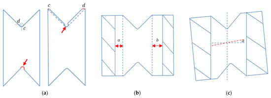 (a,b) Possible sources that may be affecting the shear stress value; (a) defect in the notch radius (marked by arrows); (b) asymmetrical gripping, a ≠ b; (c) deviation from the load line marked by the angle α.