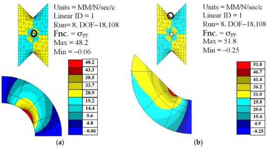 Finally, concerning the effect of the opening hole on the mechanical behavior in the shear mode for the 0° coupons, FEAs were performed mimicking the experimental results, showing the highest stress concentration in the vicinity of a notch and at a hole (Figure 26). Table 10 summarizes the results indicating that, as the hole diameter increases, the ratio of the maximum transverse, σyy, of the notch to the corresponding hole increases as well. The same trend was obtained for the shear stress ratio listed in Table 10. These results confirm the finding that the presence of holes in the double V-notch did not affect the shear stress or the shear-strain curve.