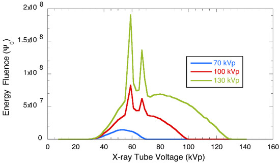 X-ray energy fluence spectra produced at 70, 100, and 130 kVp.