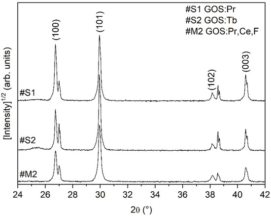 Figure 3 shows the XRD patterns of GOS:Pr (#S1), GOS:Tb (#S2), and GOS:Pr,Ce,F (#M2) in the angular range 2θ = 24°–42°, where the most intense peaks of the Gd2O2S compound are located. XRD patterns in Figure 3 are shown in square root scale ([Intensity]1/2) to enhance low-intensity peaks. Peak shape analysis and quantitative measurements were carried out on original patterns in the angular range 2θ = 5°–80°. In Figure 3, peaks of the Gd2O2S compound are indexed by the corresponding Miller indices, while the unindexed peaks are due to KBr, which was used for screen preparation.