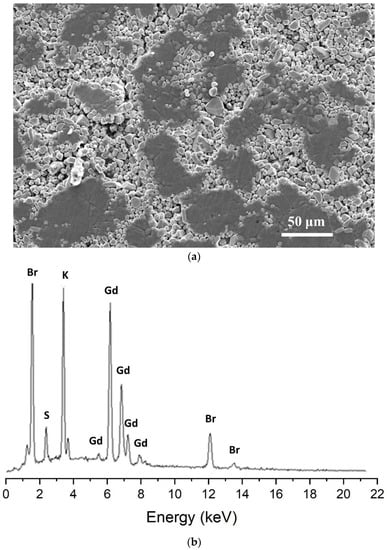 (a) SEM image of Gd2O2S screens showing the distribution of Gd2O2S (brighter regions) and KBr (darker regions) compounds. (b) EDS micro-analysis spectrum detecting main elements composing screens.