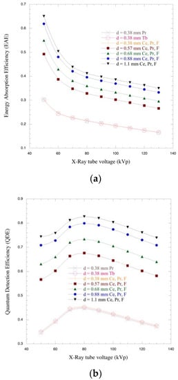 In Figure 5a,b, variations of EAE and QDE with increasing X-ray tube voltages (from 50 to 130 kVp) are reported. All the curves follow the same trend, EAE decreases with X-ray tube voltage, as expected, and this behavior is not influenced by the dopant agent but only by the thickness of the screens. In Figure 5c, it is observable that the EAE increases with the increasing thickness of the screens. In fact, a lower value of EAE is obtained for the thinner Gd2O2S:Pr,Ce,F screen (0.38 mm). Higher values were obtained for the thicker one (1.1 mm). In all the Gd2O2S screens, the dominant effect is due to the mass and energy of the source, so the EAE seems to saturate as a function of thickness to higher values and as a function of energy toward lower values.