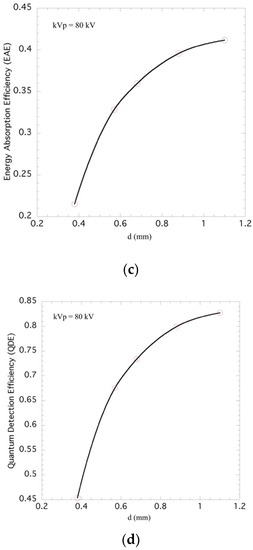 QDE increases until 80 kVp, and then it decreases for higher X-ray tube voltages (Figure 5b). This is due to the K-absorption energy edge of the gadolinium (Gd) element at 50.2 keV, which suddenly increases the X-ray absorption probability, allowing the generation of a relatively large number of K-fluorescence photons. The QDE values are higher than the EAE ones. This is due to the emerging K-fluorescence photons or scattered X-rays (Rayleigh or Compton scattering) that do not lead to local energy deposition and thus, are not included in the EAE calculations. The highest QDE value is presented for the 1.1 mm thick screen since its increased thickness enhances X-ray photon absorption (Figure 5d).