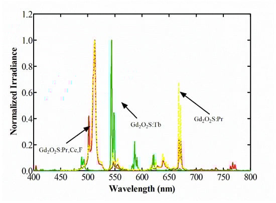 Figure 6 shows the optical photon emission spectra of Gd2O2S:Tb, Gd2O2S:Pr, and Gd2O2S:Pr,Ce,F scintillator samples under X-ray excitation. Analyzing the emission spectrum of the Gd2O2S:Tb screen, peaks are found between 475 nm and 550 nm (where the maximum is), as expected from the literature. The measured spectrum of Gd2O2S:Pr presents 2 distinct peaks at 512 nm and 668 nm, respectively. These peaks correspond to an average photon energy of 2.16 eV. From Figure 6, it can be seen that the Gd2O2S:Pr,Ce,F spectrum consists of a dominant line at 513 nm, lying in the green region of the optical spectrum, and 4 weaker peaks at 547, 640, 665, and 767 nm [33]. According to Rodnyĭ, the 5d→4f luminescence of Ce3+ ions cannot be the case in the Gd2O2S matrix since the corresponding 5d levels are within the conduction band. When any excited levels of a luminescence center fall in the conduction band, the emission is absent because of mixing with the conduction band states [34,35]. Thus, all the emission peaks are associated with 4f2–4f2 lines of Pr3+, since Ce3+ cannot be used as a luminescence center in the Gd2O2S matrix [33]. Having a maximum at 513 nm, the mean light photon energy (Eλ = hc/λ) results in 2.42 eV. Similar emission spectra were recorded from previously studied phosphor screens produced by a sedimentation technique [11,17,30].