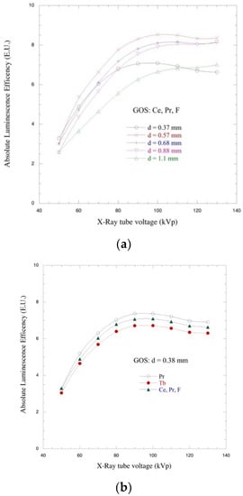 ALE seven powder screens (listed in Table 1) were investigated and experimentally valued. In Figure 7a,b, the ALE is reported as a function of X-ray tube voltages used in radiographic applications (50–130 kVp). The efficiency increases for all screens continuously with increasing X-ray tube voltage up to about 90–100 kVp. ALE curves show a tendency to saturate for higher X-ray tube voltages (100–130 kVp); the saturation proves that an excessive X-ray dose does not improve the luminescence efficiency. Among different thicknesses, the lowest value of ALE is exhibited by the thicker screen (1.1 mm), while the higher value of ALE is exhibited by the screen with 0.57 mm of thickness. Therefore, the trend is not linear (Figure 7a). Comparing powder screens doped with different materials (Figure 7b), the lower value of ALE is shown by the Gd2O2S:Tb screen, and the Pr doped appears to be the most efficient. This latter result seems to be in contrast with the literature; however, measurements were repeated a number of times with the same results. An investigation of the phenomenon is ongoing, exploring all the possible relations between structural conditions and performances.