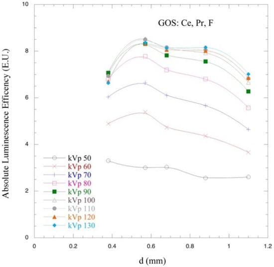 Figure 8 illustrates the ALE of 5 GOS:Pr,Ce,F screens (0.38, 0.57, 0.68, 0.88, and 1.1 mm) as a function of thickness and X-ray tube voltages. For the 0.57 mm thick screen, the corresponding absolute efficiency maximum was observed at the X-ray tube voltage of 100 kVp. Screens thicker than ~0.8 mm seem to present lower scintillation light output in the whole kilovoltage range, mainly due to the semi-transparency and optical scattering characteristics of the screens. An explanation of this can be given by considering the extended distance—from the site of scintillation creation—that the optical photons have to propagate in the thicker GOS:Pr,Ce,F screen of, i.e., 1.1 mm, leading to optical photon loss inside the phosphor mass. In addition to the screen’s thickness, the optical photon losses are a function of the grain size, the optical photon energy, the index of refraction of the material, and errors in the detector’s manufacturing processes [22].