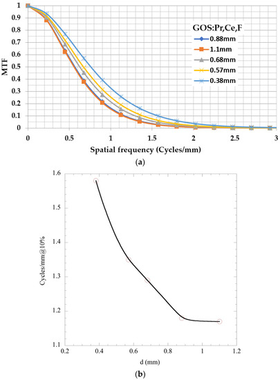 In Figure 9a, the MTF of the examined co-doped screens is reported. Here, the thinner 0.38 mm screen exhibits the highest resolution value (1.58 cycles/mm @ 10%), whereas, as the thickness of the screen increases, resolution degrades progressively. The corresponding values of the thicker screens are: 1.35 cycles/mm@10% for the 0.57 mm screen, 1.29 cycles/mm@10% for the 0.68 mm screen, 1.18 cycles/mm@10% for the 0.88 mm screen, and 1.17 cycles/mm@10% for the thicker 1.1 mm screen. It can be seen that the resolution loss is limited after the thickness of 0.88 mm since the 0.88 mm and the 1.1 mm screens appear with almost the same resolution properties (Figure 9a). The relatively low-resolution values are attributed to the thickness of the prepared samples. Thinner screens of similar Gd2O2S:Pr,Ce,F powder material (coating thickness of 35.7 mg/cm2) were found to have an MTF value of 4.2 cycles/mm@10% in previous studies [36]. The coating thickness of 35.7 mg/cm2 corresponds to a 97.27 µm thick screen, assuming a density of 7.34 g/cm3 and a 50% packing density. This thickness, which is almost 4 times less than the thinner sample prepared in this study, is considered typical for low-energy applications such as mammography, where commercial screens can be found with thicknesses of the order of 118.9 µm [37]. As the energy increases, thicker screens are used with thicknesses up to some millimeters. Figure 9b summarizes the MTF related to different thickness.