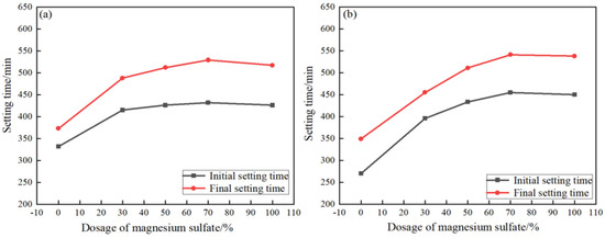 The setting time of MOC at different mass fractions of MgSO4 (a): 6:1:15; (b): 7:1:18.