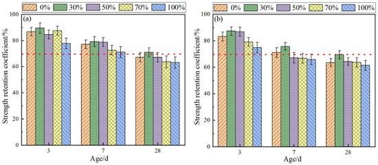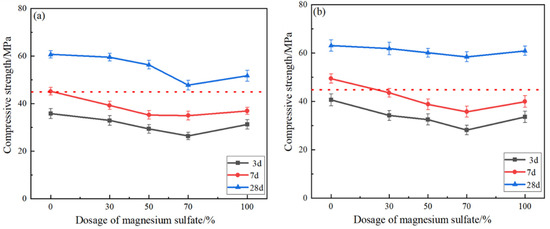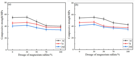 The compressive strength of MOC with different mass fractions of MgSO4 after water immersion (a): 6:1:15; (b): 7:1:18.