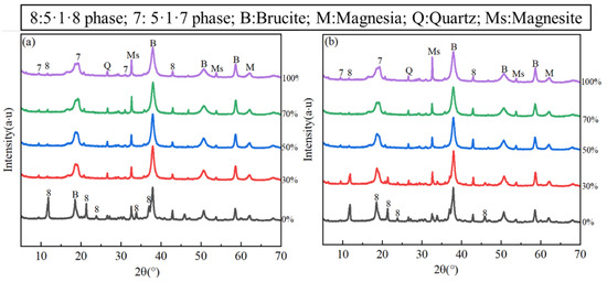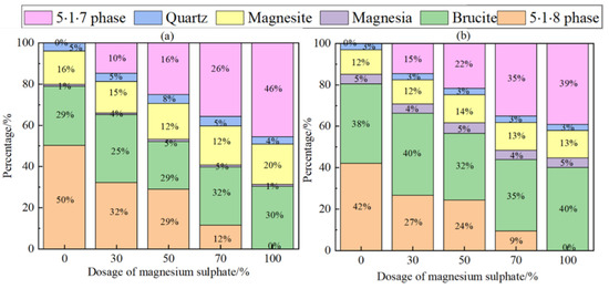 The content of 5·1·8 phase gradually decreases from 50% to 0% with the increase of the mass fraction of MgSO4 (Figure 6a). The content of 5·1·7 phase increases from 0% to 46% with the increase of the mass fraction of MgSO4. The content of Mg(OH)2 generally decreases firstly and then increases with the increase of the mass fraction of MgSO4. This may be due to the addition of MgSO4 causing the growth of 5·1·8 phase and 5·1·7 phase to compete with each other, which hinders the production of Mg(OH)2. In addition, the content of Mg(OH)2 was as high as 30−40%. The foremost reason was that the mix ratio selected in this study provides excess water.