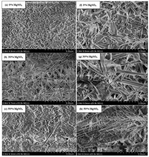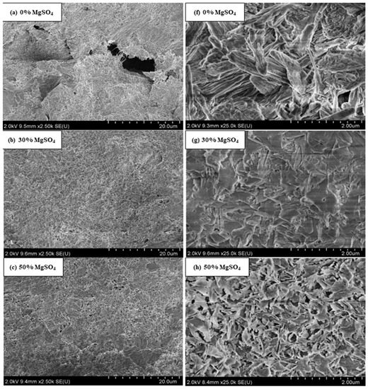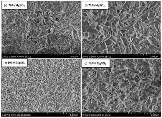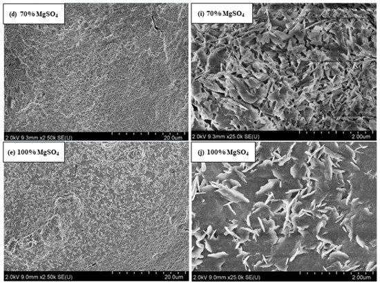 The SEM images with different mass fractions of MgSO4 cured in air for 28 days are shown in Figure 7. It can be seen that the different mass fractions of MgSO4 have an obvious influence on the micro morphology of magnesium cementitious material. It can be observed that the matrix surface structure of the mixed system was loose compared with the pure MOC and MOS systems (Figure 7a–e). Meanwhile, there are pores in the matrix, which was one of the reasons for the reduction of compressive strength of the mixed system. When the matrix was further enlarged, it was found that the MOC system mainly contains a large number of needle-rod crystals dispersed in gelled crystals, forming a continuous structure with high compactness and a strong connection between crystals (Figure 7f–j). The pure MOS system was mainly composed of a large number of flake crystals, granular crystals, and gelled crystals. When adding MgSO4, increasing the mass fraction of MgSO4 to 50 wt%, the hydration products of the mixed system have a poor crystallization state, the internal crystals change to become long and needle-shaped, the size distribution range of the needle-shaped crystals becomes wide, and the degree of cross-linking between crystals was reduced. When the mass fraction of MgSO4 continued to increase to 70 wt%, there were not only rod-like crystals, but also flake crystals. This further leads to the reduction of the cross-linking degree of the mixed system and the less dense structure, which renders the compressive strength of the mixed system lower.