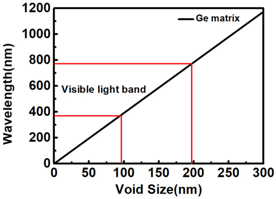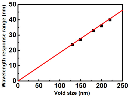 Figure 8. The relationship between wavelength response range and void sizes predicted by Bragg–Snell’s law (Equation (8)) can be plotted as a straight line (red line in