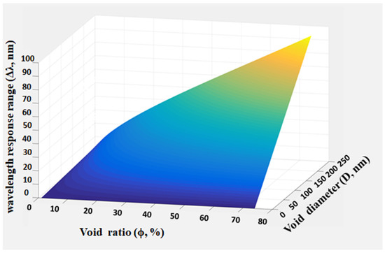ϕ). When the void ratio reaches 74% and the void size is 250 nm, the wavelength response range (Δ